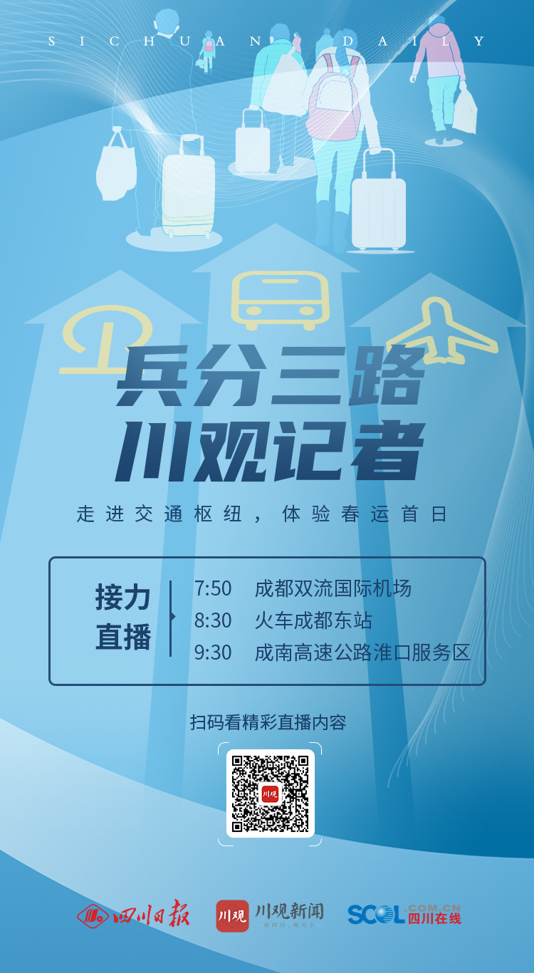 春运首日,川观记者将兵分三路,分别走进机场、火车站和高速公路,并采取接力直播的方式,聚焦不同时段的交通枢纽实况,体验春运首日出行。