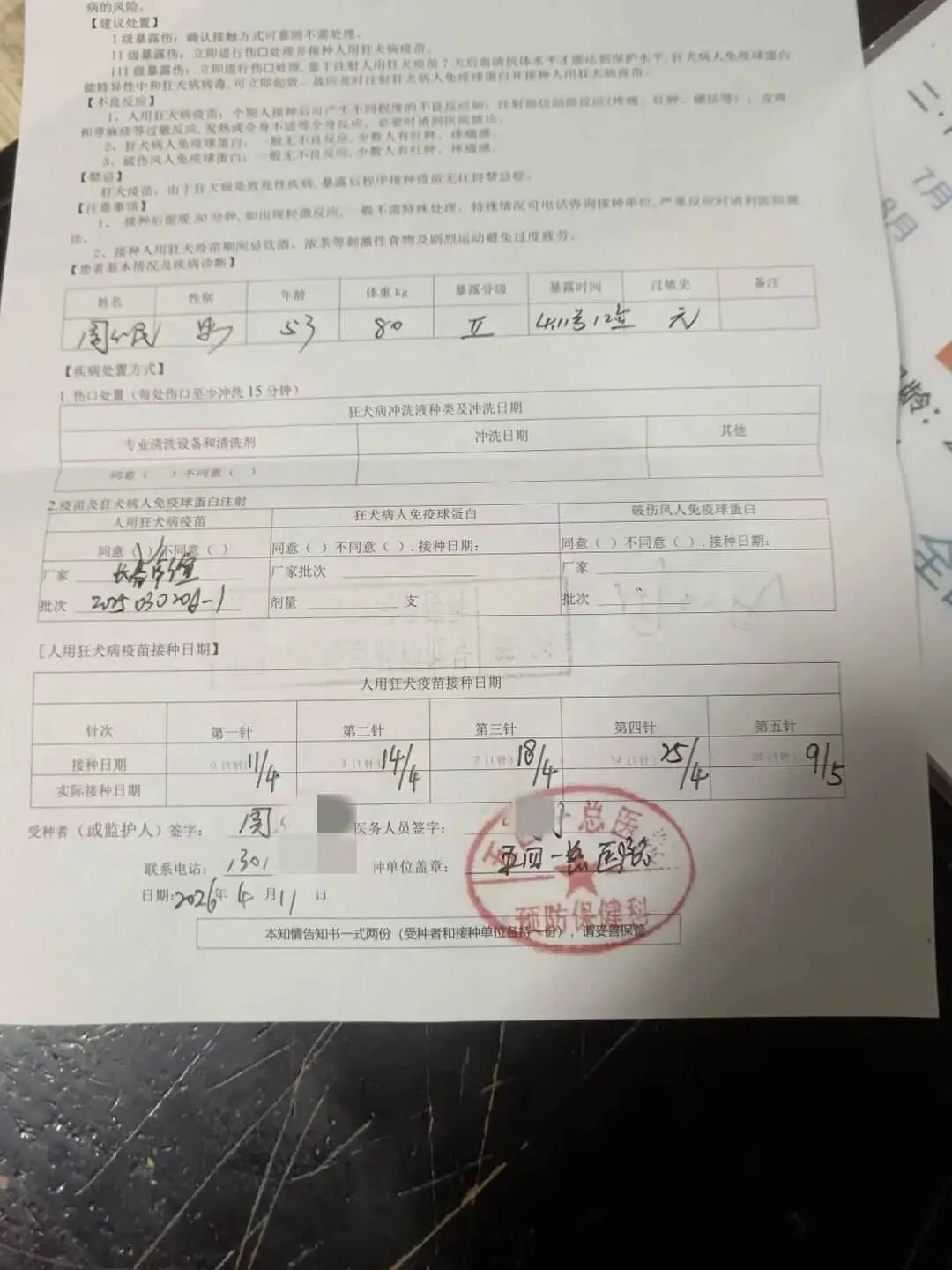 11日下午6点过,周先生在五四一总医院接种了狂犬疫苗(受访者供图)