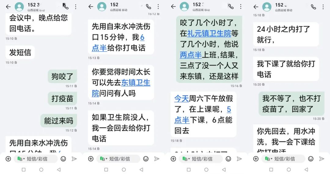 “急诊科的人给了我一个打疫苗医生的电话,我打过去没人接。”周先生说。下午3点10分,对方发来信息:“会议中,晚点给您回电话。发短信。”得知周先生要打狂犬疫苗,对方陆续回复了以下信息: