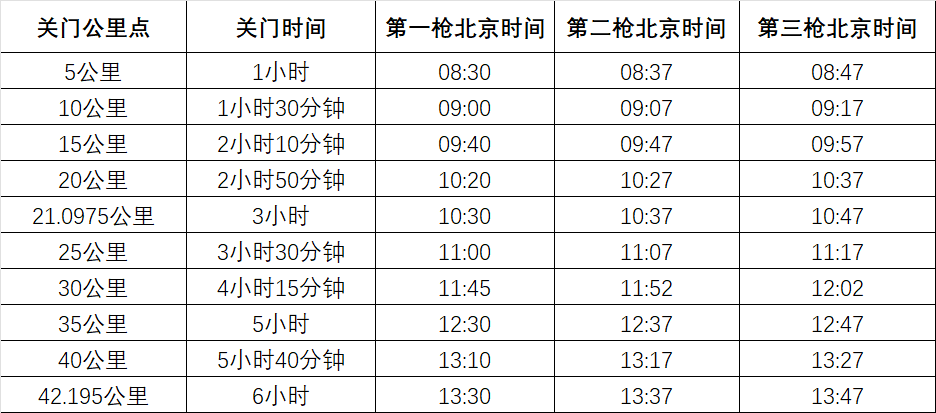 为了保证参赛选手比赛安全,限时对社会交通进行临时管制、滚动放行。比赛路线各段专设了关门时间,到达关门时间后,相应公里点的计时毯停止工作,相应路段将恢复社会交通。在规定关门时间内,未跑到相应公里点的参赛选手须立即停止比赛,退出赛道,以免发生危险。退出比赛的马拉松和半程马拉松项目选手可乘坐组委会提供的收容车到达相应项目的赛后指定区域。