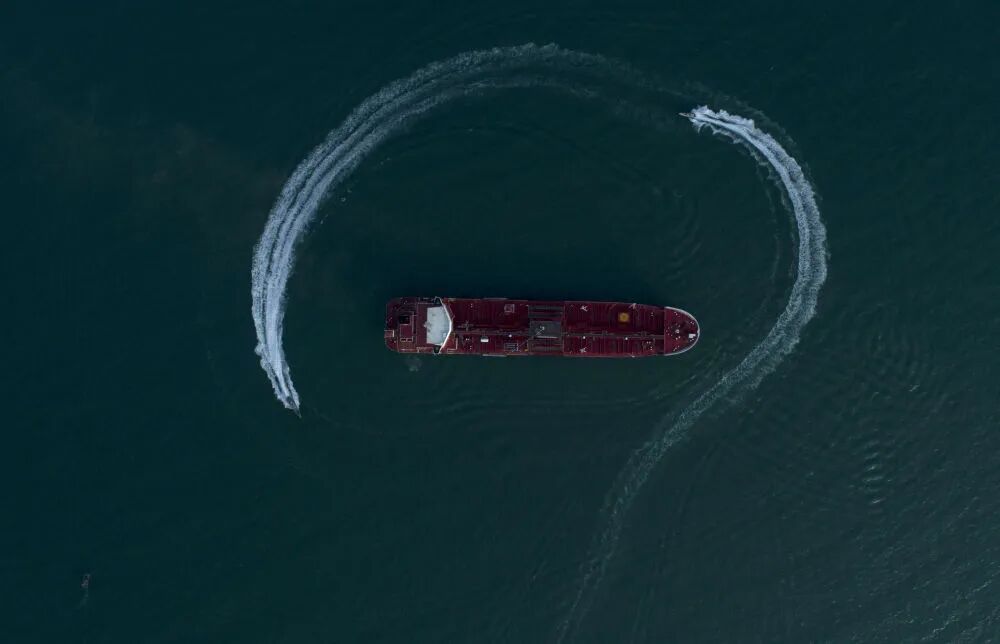 图为2019年7月21日,在霍尔木兹海峡附近水域,伊朗伊斯兰革命卫队船只在被扣押的一艘英国油轮周围游弋。新华社/伊朗学生通讯社