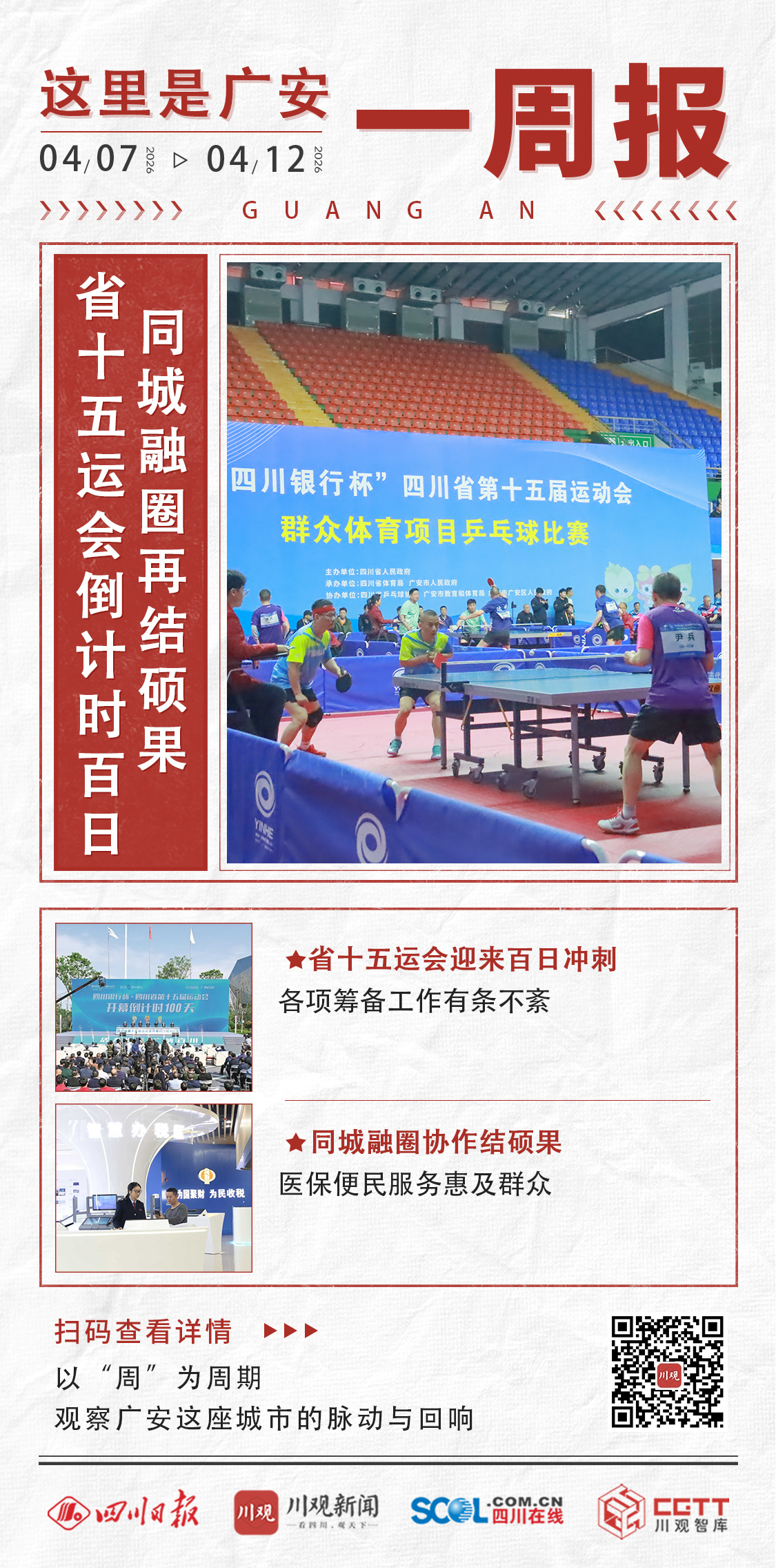 本周(4月7日至12日),四川省第十五届运动会开幕式倒计时100天启动仪式举行,筹备进程井然有序;广安入选全国首批医保便捷支付推进地区,与重庆北碚区联合印发《北碚广安一体化协同高质量发展2026年度任务清单》,持续提升民生福祉。