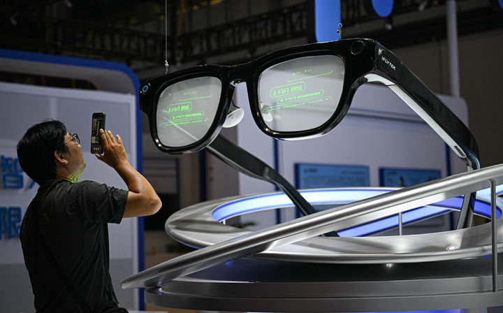 2026年4月10日在第六届消博会主会场拍摄的AI眼镜模型。新华社记者 蒲晓旭 摄