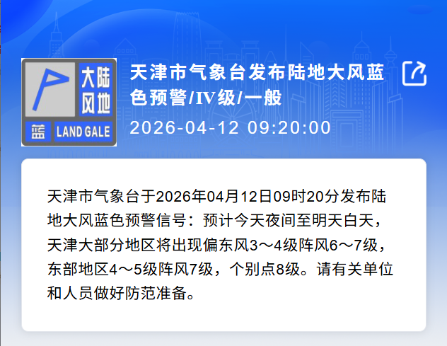 目前陆地大风蓝色预警信号、