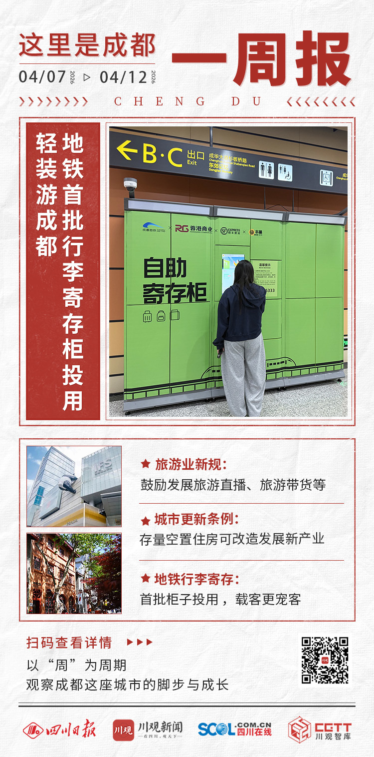 成都地铁首批行李寄存柜近日在东郊记忆站、熊猫大道站投用,共30个格口,扫码30秒即可寄存。第二批站点已启动调研,未来还将研究同城行李寄递功能。