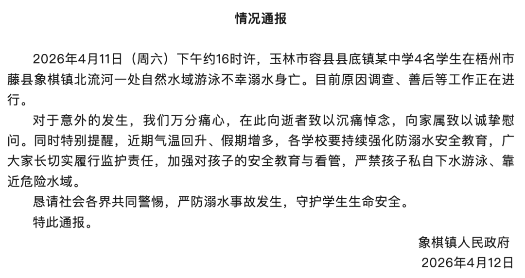 2026年4月11日(周六)下午约16时许,玉林市容县县底镇某中学4名学生在梧州市藤县象棋镇北流河一处自然水域游泳不幸溺水身亡。目前原因调查、善后等工作正在进行。