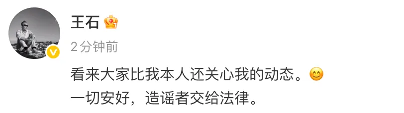 随后,王石本人回应:看来大家比我本人还关心我的动态。一切安好,造谣者交给法律。
