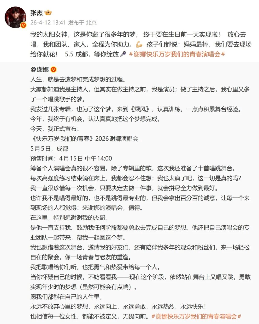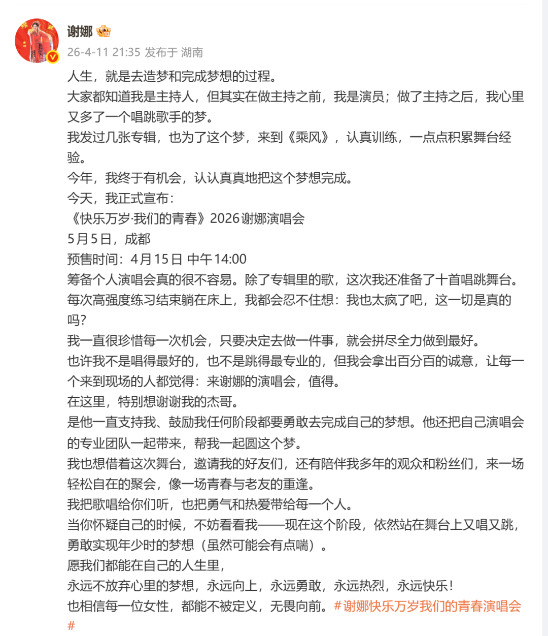 4月11日,谢娜在《乘风2026》直播中官宣开演唱会。随后,谢娜发长文回应:“筹备个人演唱会真的很不容易。除了专辑里的歌,这次我还准备了十首唱跳舞台。在这里,特别想谢谢我的杰哥。是他一直支持我、鼓励我任何阶段都要勇敢去完成自己的梦想。他还把自己演唱会的专业团队一起带来,帮我一起圆这个梦。我把歌唱给你们听,也把勇气和热爱带给每一个人。”