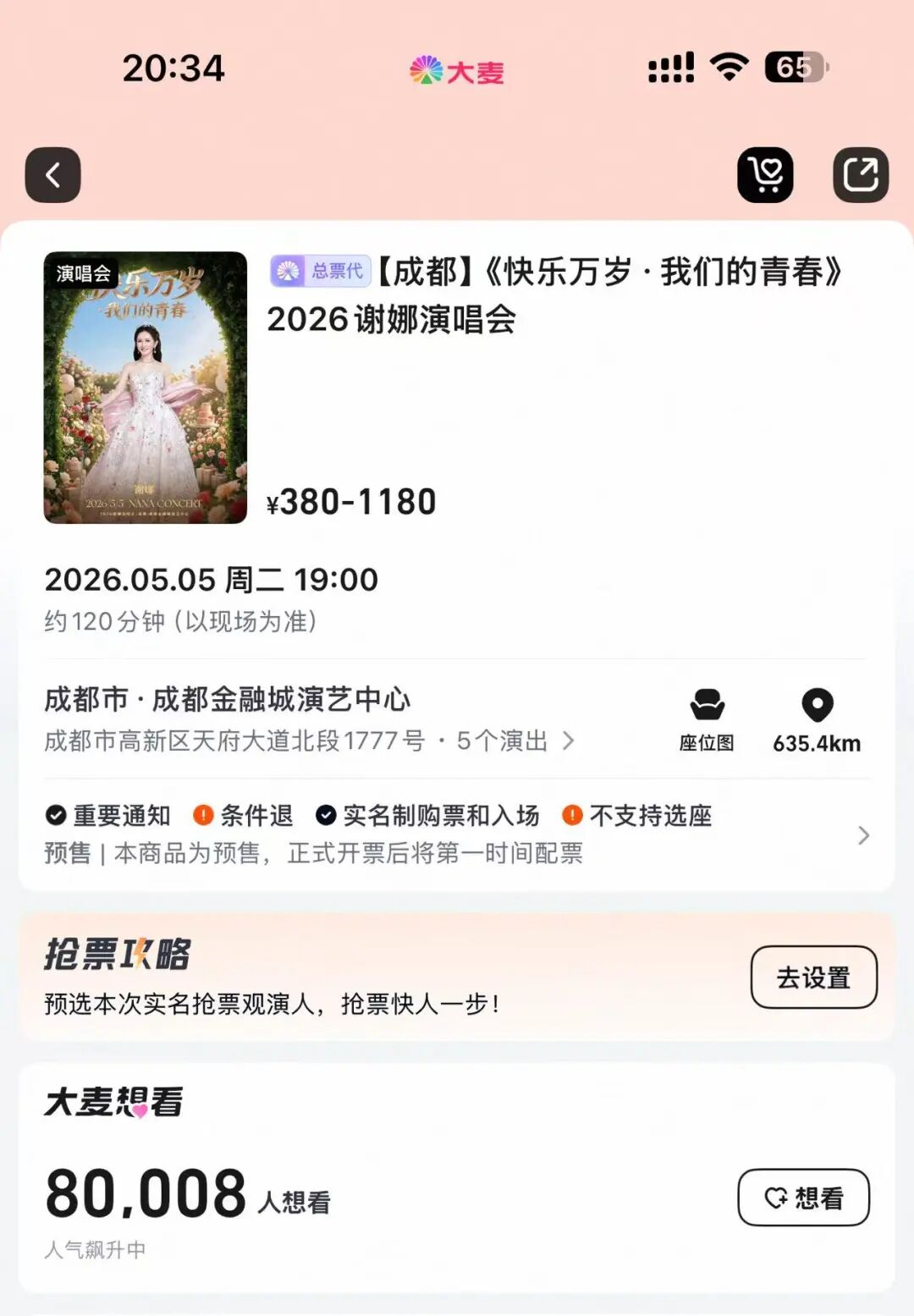 售票平台显示,谢娜5月5日成都演唱会票价为380元-1180元,共6档。截至12日20时34分,谢娜成都演唱会实时想看人数已超8万人。