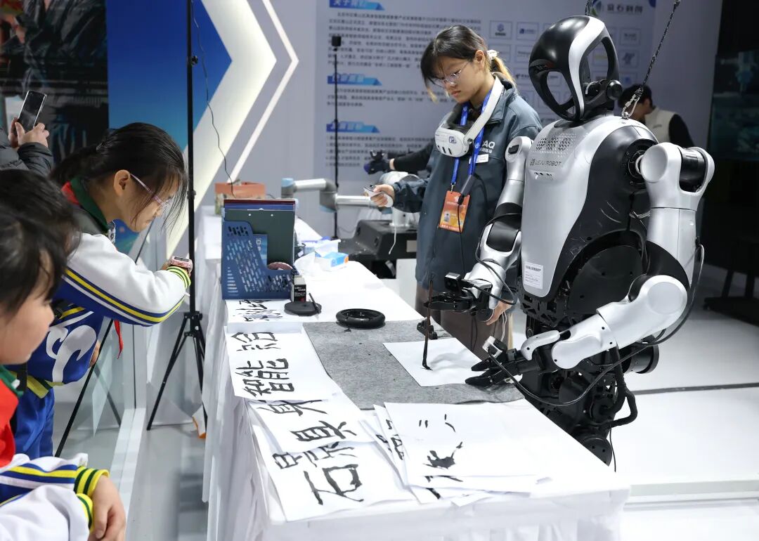 在二〇二六北京国际科幻与未来产业博览会现场,一款机器人在展示书写毛笔字。