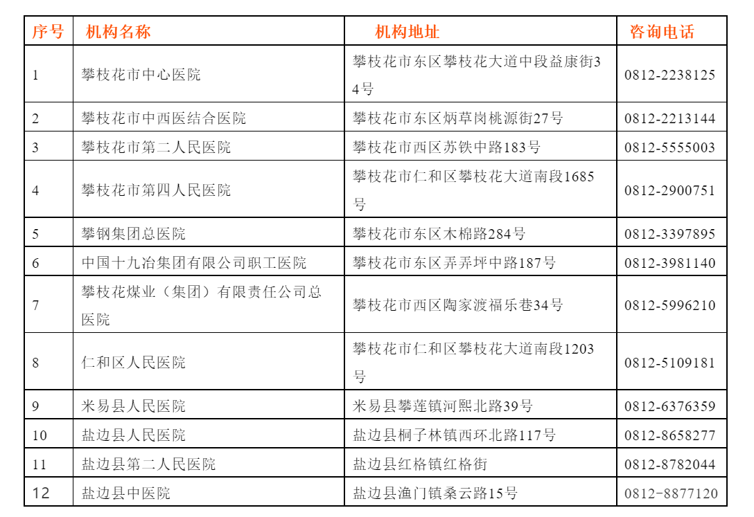 目前,攀枝花开展新冠病毒核酸检测的医疗机构信息共有12家。其中,攀枝花市中心医院可提供24小时新冠病毒核酸检测服务,为攀西地区首家。