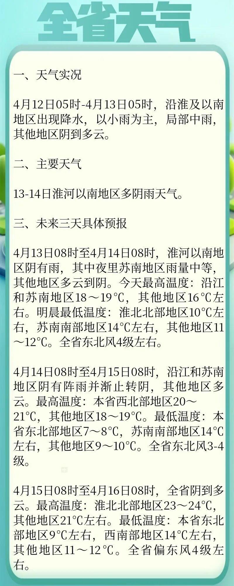 江苏气象预报13-14日淮河以南地区多阴雨天气