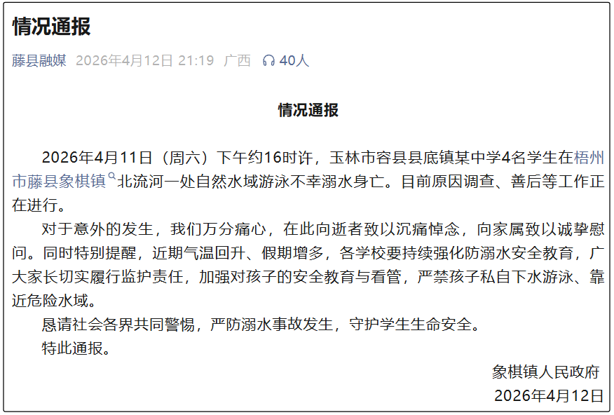 广西梧州市藤县象棋镇人民政府4月12日通报,4月11日16时许,玉林市容县县底镇某中学4名学生在象棋镇北流河一处自然水域游泳不幸溺水身亡。目前,事故原因调查、善后等工作正在进行中。