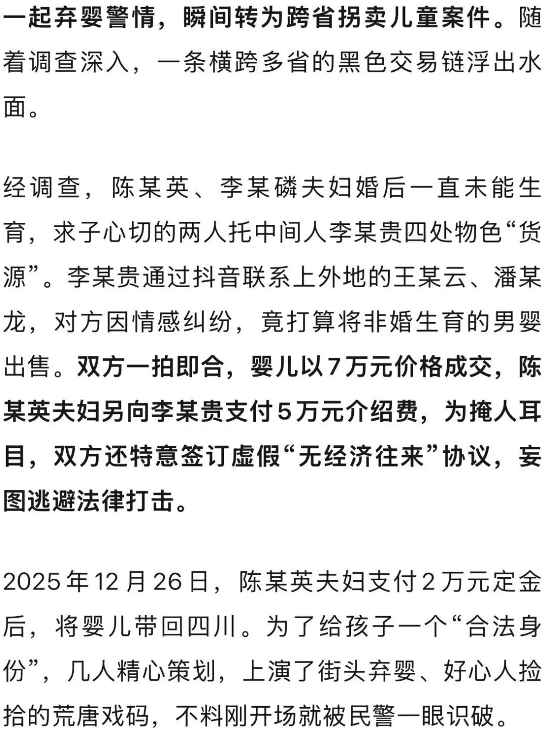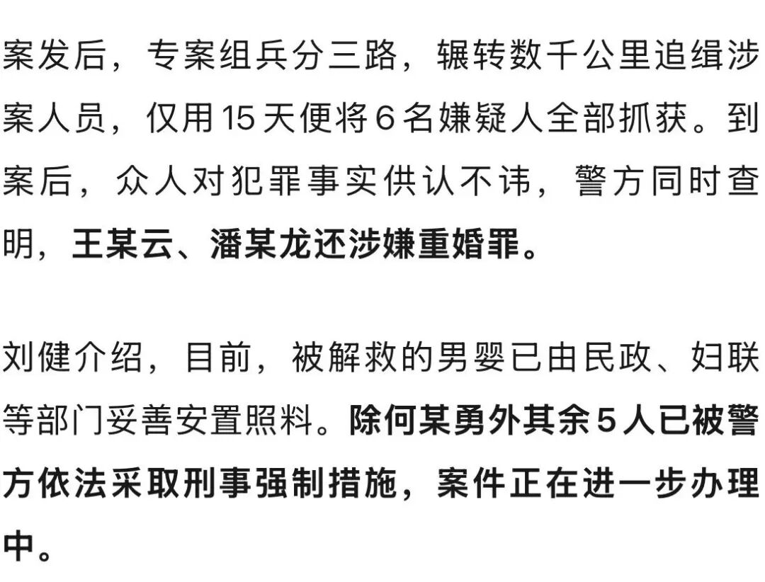 近期宜宾警方破获一起跨省拐卖儿童案,6名涉案人员悉数落网,其中5人已被依法采取刑事强制措施。