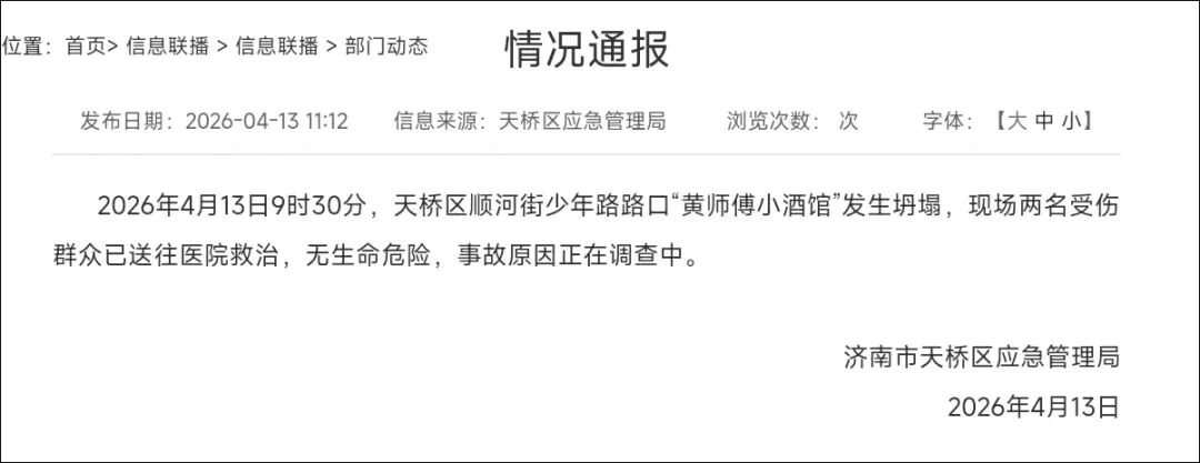 济南市天桥区应急管理局发布通报,2026年4月13日9时30分,天桥区顺河街少年路路口“黄师傅小酒馆”发生坍塌,现场两名受伤群众已送往医院救治,无生命危险,事故原因正在调查中。