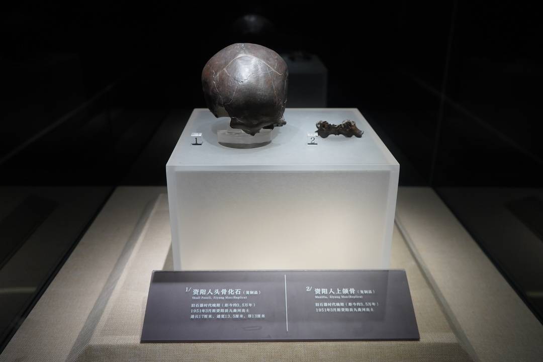 在四川资阳市博物馆“寻梦原乡”展厅,当地出土的“资阳人”头骨化石和上颌骨的复制品静静陈列。