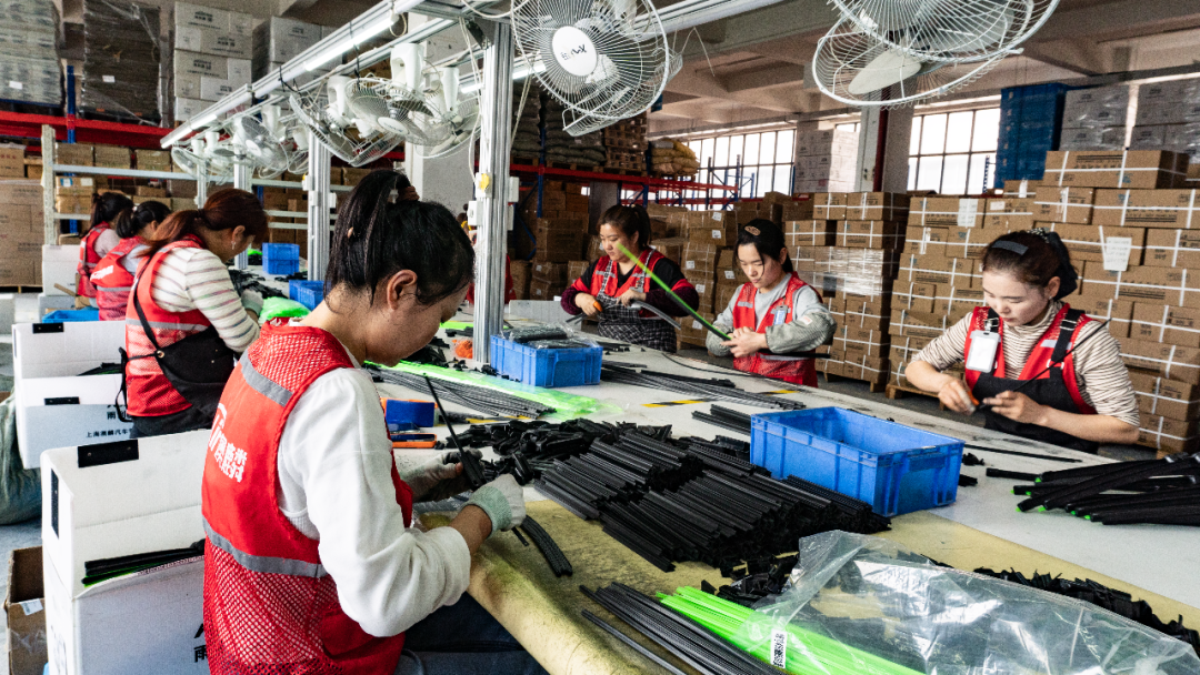 工人在生产线上熟练组装雨刮器零部件。马琳|摄