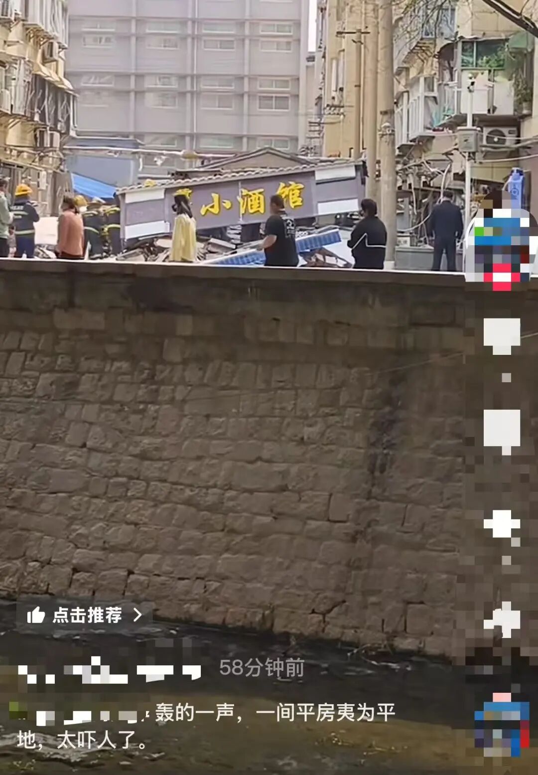 视频画面显示,一家牌匾为“某某某小酒馆”的商铺发生坍塌,房屋几乎成为废墟,仅剩牌匾倒在瓦砾之上,邻近居民楼部分窗户玻璃破碎,不少市民在旁驻足。