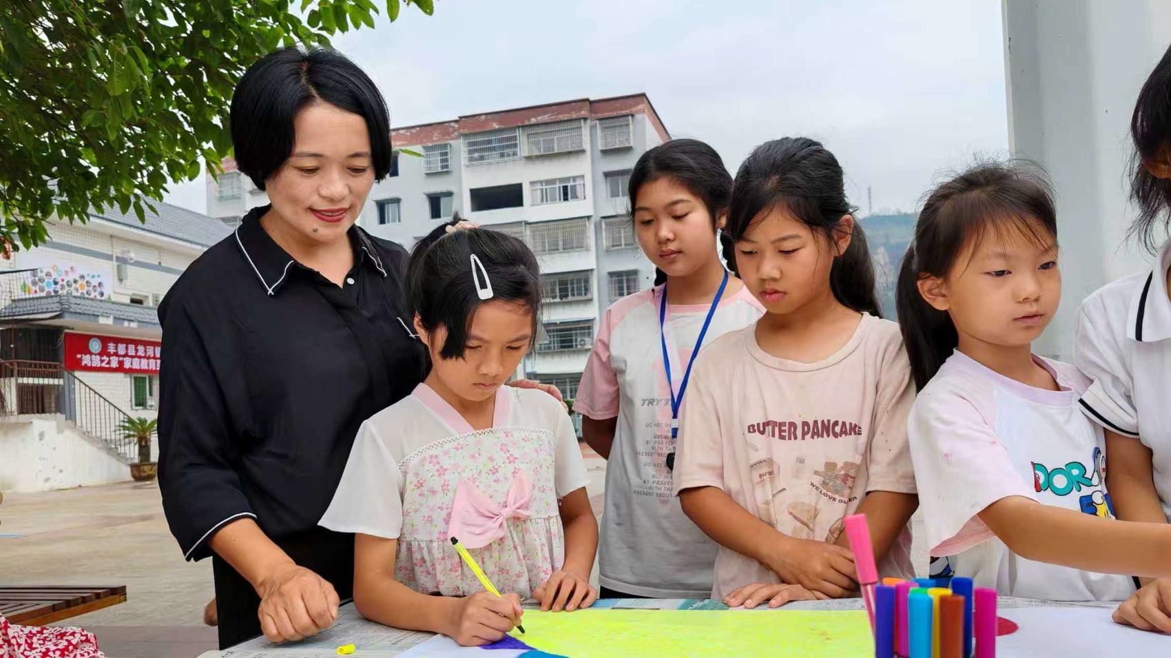 互助会会长杨远芬带领孩子们进行共绘未来长图