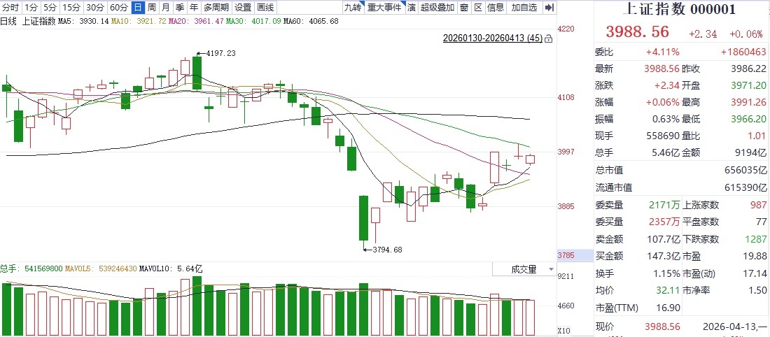 截至收盘,上证指数报收3988.56点,上涨0.06%;深证成指报收14407.86点,上涨0.69%;创业板指报收3476.44点,上涨0.8%。不过,在4月13日的反弹中,A股市场的成交额并未同步放大。统计数据显示,沪深京三市成交额为21633亿元,较前一交易日萎缩了1700亿元。