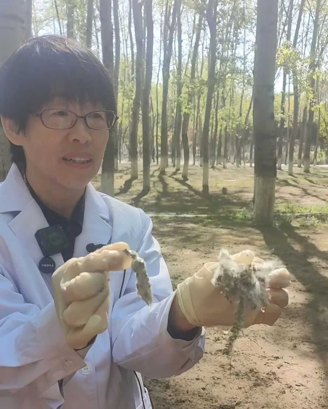图为王艳春展示使用凝絮剂前后的飞絮状态。尚玉摄。