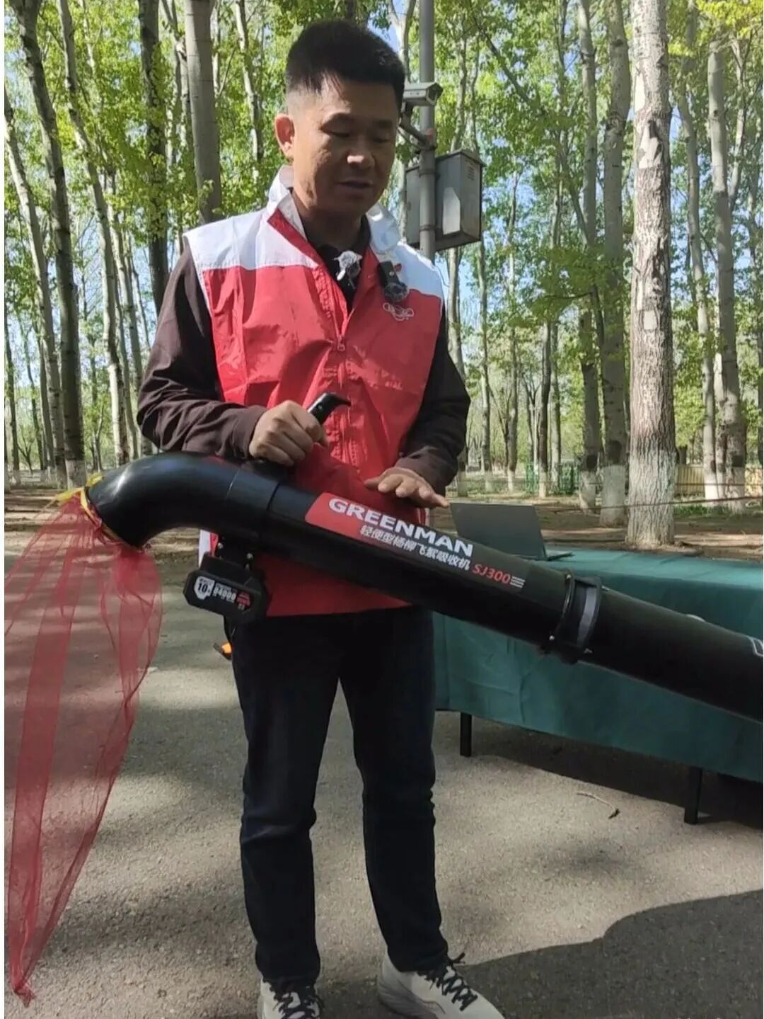 图为绿友集团工作人员介绍手提式杨柳飞絮吸收机。尚玉摄