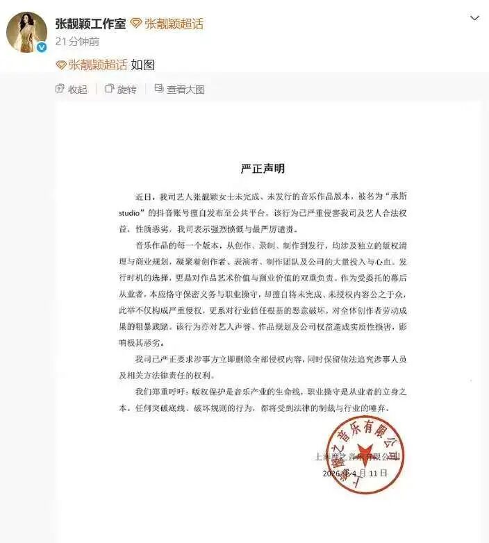 4月11日,歌手@张靓颖 发博怒斥工作人员泄露其未发行作品版本。随后,张靓颖工作室发布严正声明称,账号“承斯studio”擅自发布艺人张靓颖未完成、未发行的音乐作品版本至公共平台,该行为已严重侵害我司及艺人合法权益,性质恶劣,并表示强烈愤慨与最严厉谴责。已严正要求涉事方立即删除全部侵权内容,同时保留依法追究涉事人员及相关方法律责任的权利。