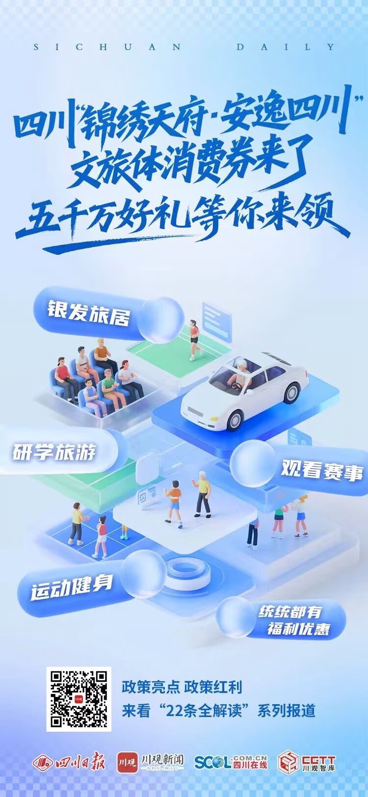 在近日省政府办公厅印发的《关于巩固拓展经济稳中向好势头的若干政策措施》(以下简称“22条”政策)中,在大力支持消费提振方面,省级层面首次提出发放“锦绣天府·安逸四川”文旅体消费券,并重点围绕银发旅游旅居、研学旅游、体育健身、体育培训(体育进社区)、观赛参赛等领域。