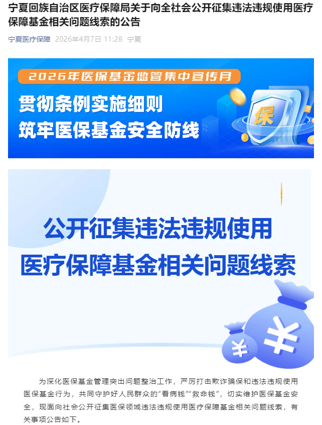 宁夏回族自治区公开征集违法违规使用医疗保障基金相关问题线索