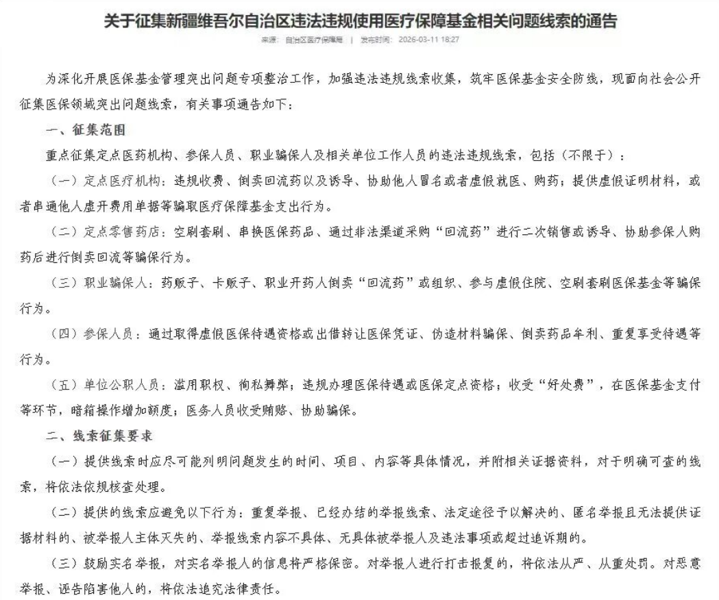 新疆维吾尔自治区医疗保障局关于征集问题线索的通告