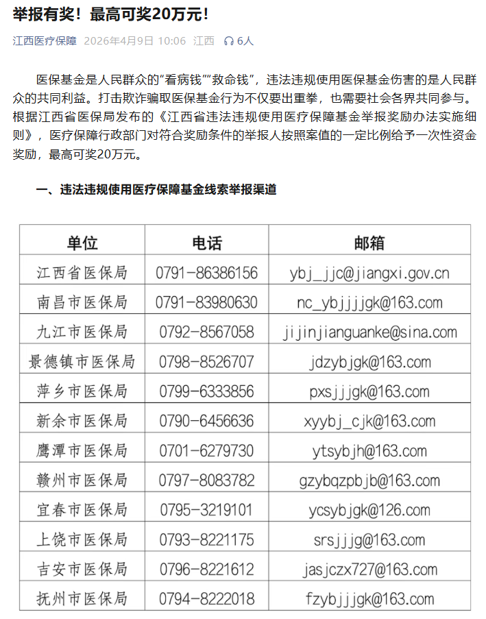 近日,为深化医保基金管理突出问题整治,充分调动广大人民群众参与医保基金监管的积极性、主动性,全国各地医保部门陆续发布公告,面向全社会公开征集违法违规使用医保基金问题线索,接受群众举报监督,举报线索经查证属实,将按规定给予奖励,最高奖励20万元。