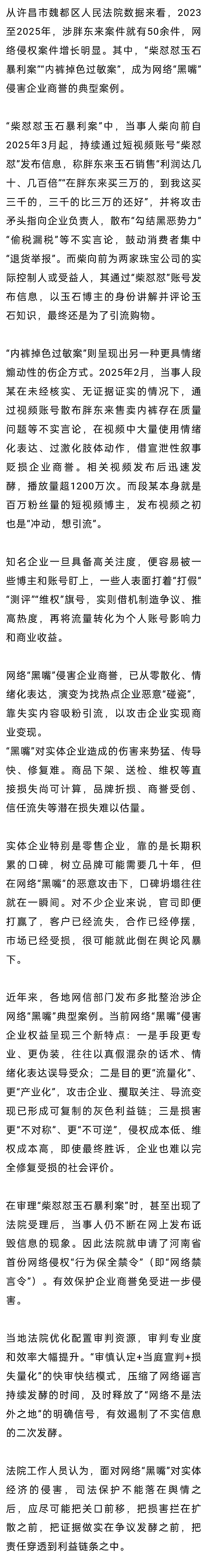 近来,河南商超胖东来诉网络“黑嘴”侵权案被写入最高法工作报告。因侵权收益高、违法成本低、固定证据难等因素,网络“黑嘴”伤害企业的行为屡禁不止,且呈现出职业化、链条化、跨平台扩散特征,企业稍有不慎便可能陷入“赢了官司、输了市场”的困境。