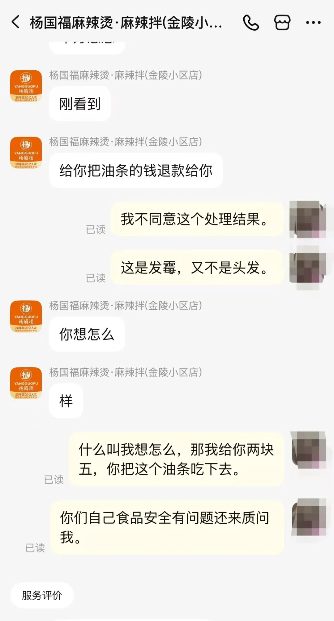 4月12日,有网友发帖称,在南京杨国福麻辣烫·麻辣拌金陵小区店点外卖时,发现包装好的火锅油条发霉,与商家沟通后,对方仅提出退还2.5元油条费用,处理方式引发消费者不满。