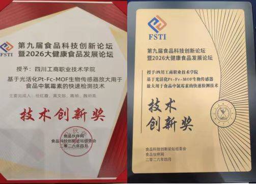 本次食品科技创新论坛专业性强、评审标准严苛,吸引众多双一流高校及行业顶尖企业参与角逐。学校轻工工程学院省级科研创新团队携相关检测技术成果亮相论坛,由任红霞博士牵头的《基于光活化Pt-Fc-MOF生物传感器放大用于食品中氯霉素的快速检测技术》项目,经过层层评审,成功获评技术创新奖。值得关注的是,我校是本次评选中唯一获奖的高校单位,实现高职院校在该高端赛事奖项上的突破。