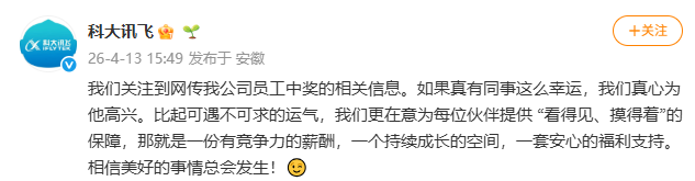 13日下午,@科大讯飞 发文回应:“我们关注到网传我公司员工中奖的相关信息。如果真有同事这么幸运,我们真心为他高兴。比起可遇不可求的运气,我们更在意为每位伙伴提供‘看得见、摸得着’的保障,那就是一份有竞争力的薪酬,一个持续成长的空间,一套安心的福利支持。相信美好的事情总会发生!”