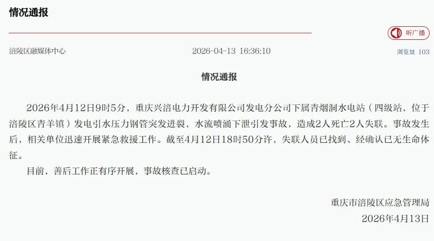 记者13日从重庆市涪陵区应急管理局了解到,4月12日9时5分,重庆兴涪电力开发有限公司发电分公司下属青烟洞水电站(四级站,位于涪陵区青羊镇)发电引水压力钢管突发迸裂,水流喷涌下泄引发事故,造成2人死亡2人失联。