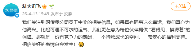 4月13日,科大讯飞官方账号回应网传“员工中1500万彩票后离职”。
