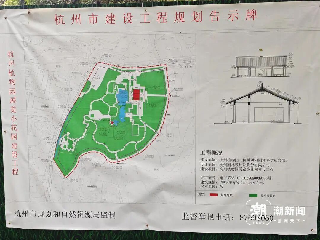 在施工围挡上悬挂着《杭州市建设工程规划告示牌》,告示牌上的信息显示,正在进行的工程为“杭州植物园展览小花园建设工程”,规模为13944平方米,其中建筑面积118.72平方米。