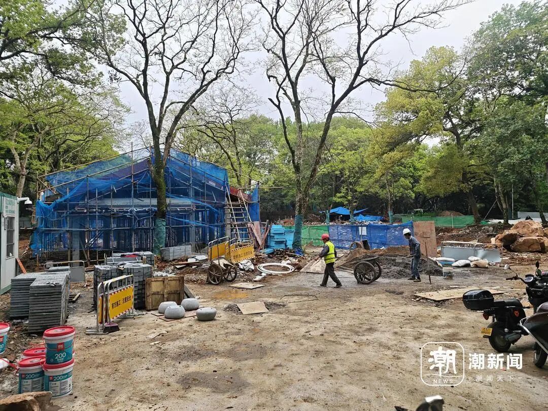 记者注意到,靠近北门主干道,中式风格的新建筑已经完成了框架搭建,有了雏形,两名工人正在工地上施工。建筑前方,挖出了一个土坑,周围堆放着地砖、石块等材料。工地内部,有大型机械正在施工。