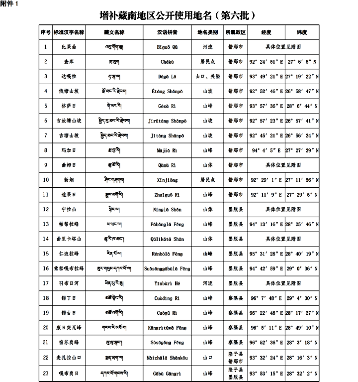 根据国务院地名管理的有关规定,我部会同有关部门对我国藏南地区部分地名进行了标准化处理。现正式公布第六批增补藏南地区公开使用地名(共23个)。
