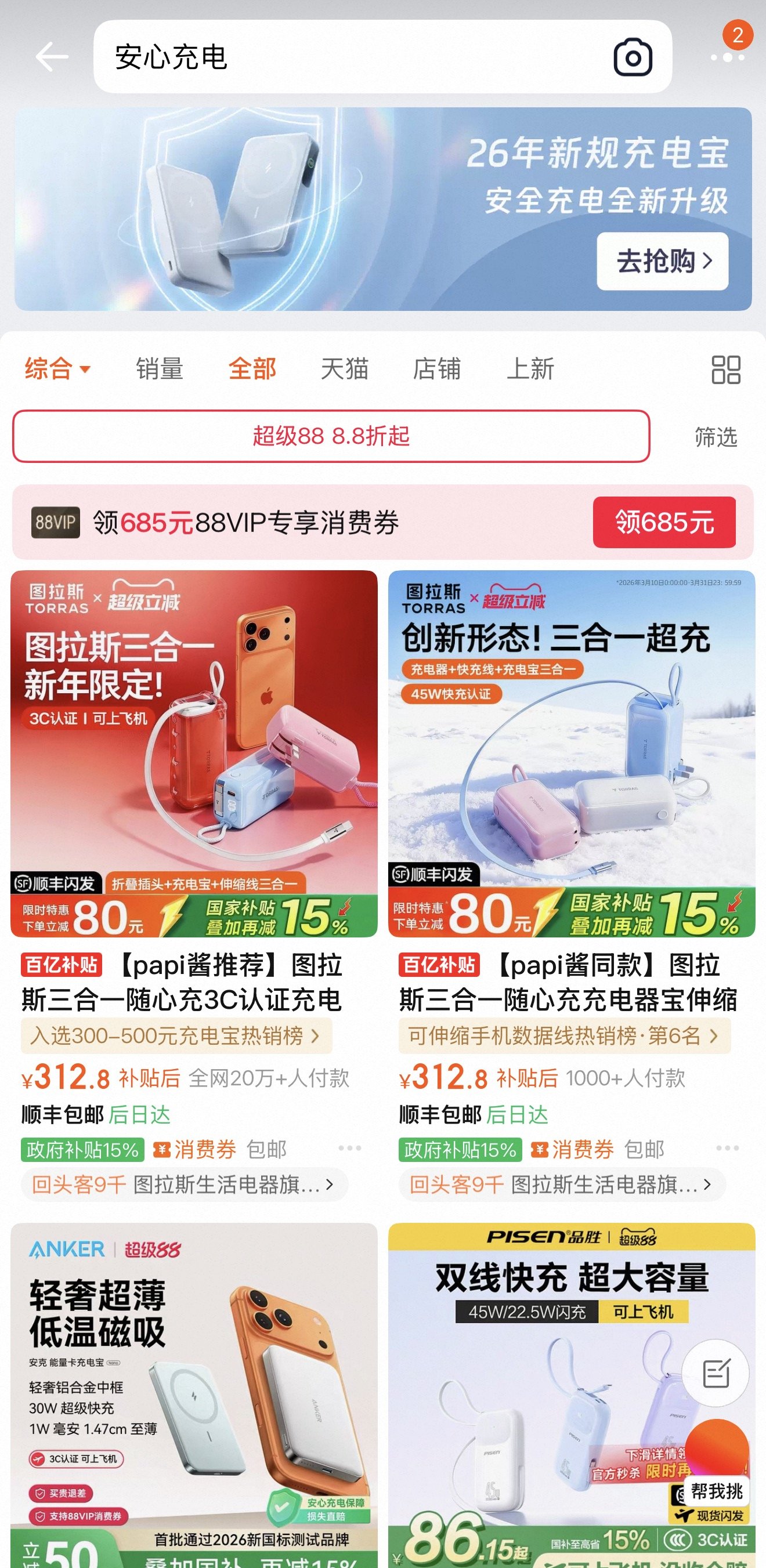 记者注意到,淘宝/天猫平台上搜索“安心充电”,将在搜索结果顶部出现专区入口。4月8日,天猫宣布携手小米、Anker、品胜、绿联、倍思、联想等十余家深度参与标准起草的行业头部品牌,推出“充电宝新规”专区,落实新国标,上新多款合规新品,覆盖不同容量和价位。