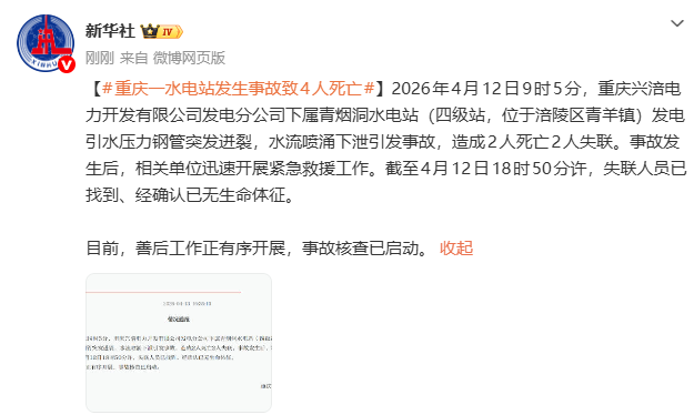 2026年4月12日9时5分,重庆兴涪电力开发有限公司发电分公司下属青烟洞水电站(四级站,位于涪陵区青羊镇)发电引水压力钢管突发迸裂,水流喷涌下泄引发事故,造成2人死亡2人失联。事故发生后,相关单位迅速开展紧急救援工作。截至4月12日18时50分许,失联人员已找到、经确认已无生命体征。
