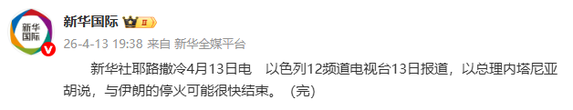 新华社耶路撒冷4月13日电以色列12频道电视台13日报道,以总理内塔尼亚胡说,与伊朗的停火可能很快结束。