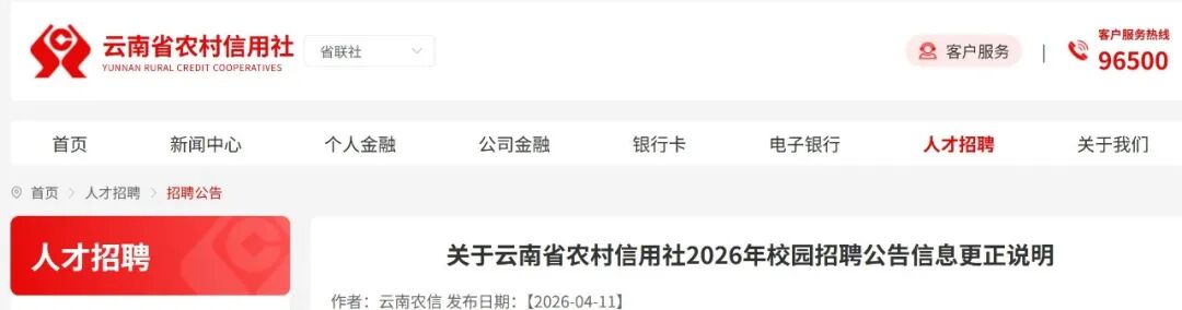 云南省农村信用社4月11日发布《关于云南省农村信用社2026年校园招聘公告信息更正说明》,全文如下: