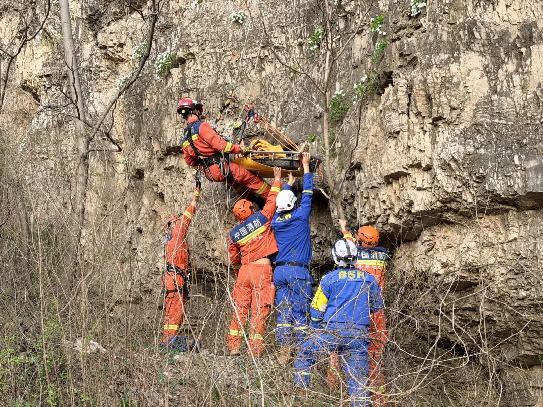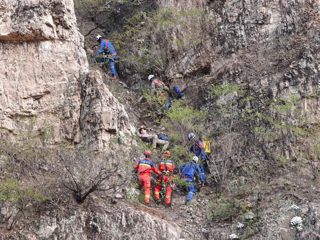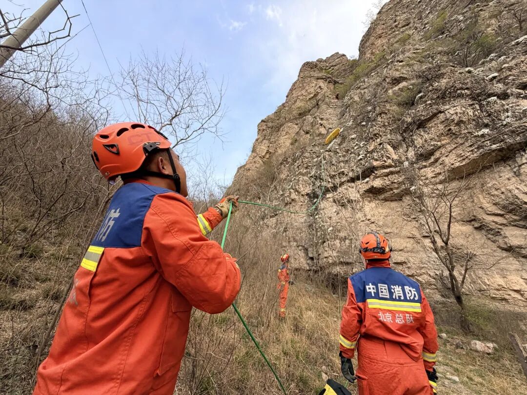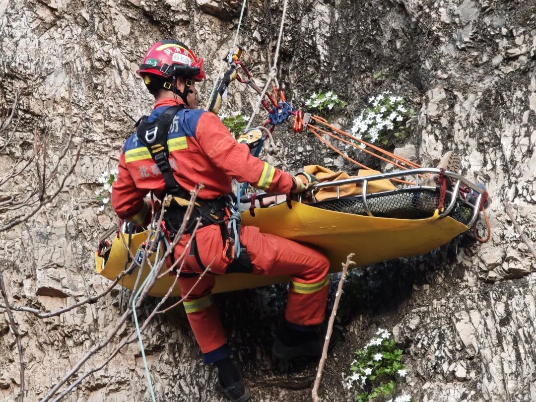 4月12日14时许,门头沟区斋堂消防救援站接到报警,在斋堂镇向阳口村附近的野山上,一名男性登山者意外坠崖,生命垂危,急需救援。接警后,消防员立即携带绳索、担架及通讯装备,火速赶往现场。