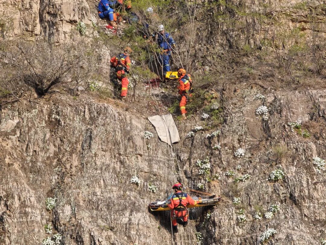 接警后,消防、公安、蓝天等多支力量火速营救,救援人员克服岩壁风化、碎石锋利、缺乏锚点、落差巨大等极端困难,搭建稳固的绳索担架下降系统,历时近两小时,成功将伤者运回地面。