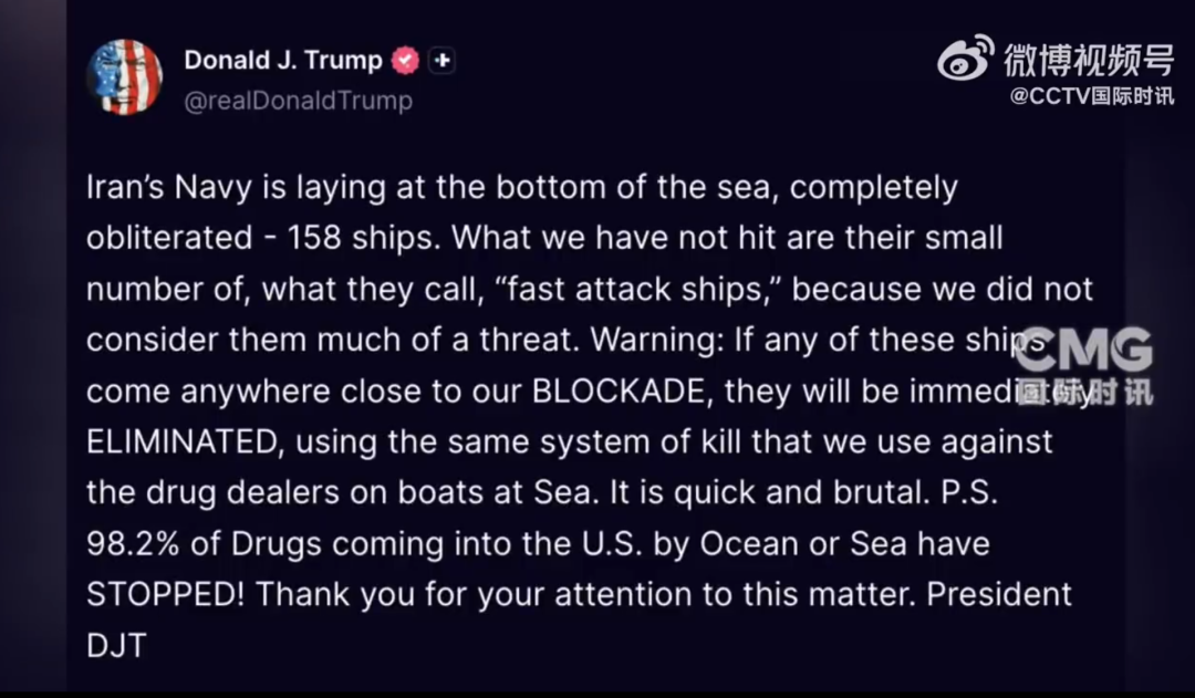 美国总统特朗普4月13日在社交媒体发帖称,“伊朗海军正沉在海底,已被彻底摧毁共计158艘舰船。我们尚未打击的是他们少量的所谓‘快速攻击艇’,因为我们认为它们构不成多大威胁。如果这些船只胆敢靠近我们的封锁线,将立即予以歼灭,手段同我们在海上打击贩毒船只时使用的击杀系统一样。这既迅速又残酷。”