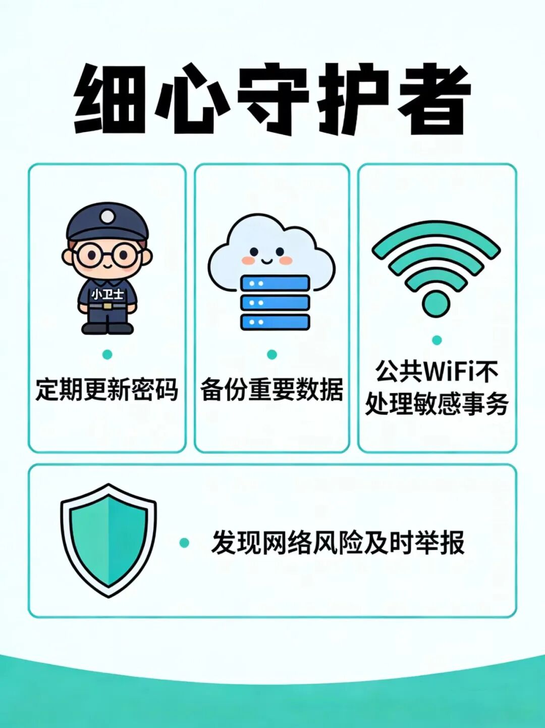 -- 做细心守护者:规范密码、谨慎用公共 WiFi,发现风险及时举报