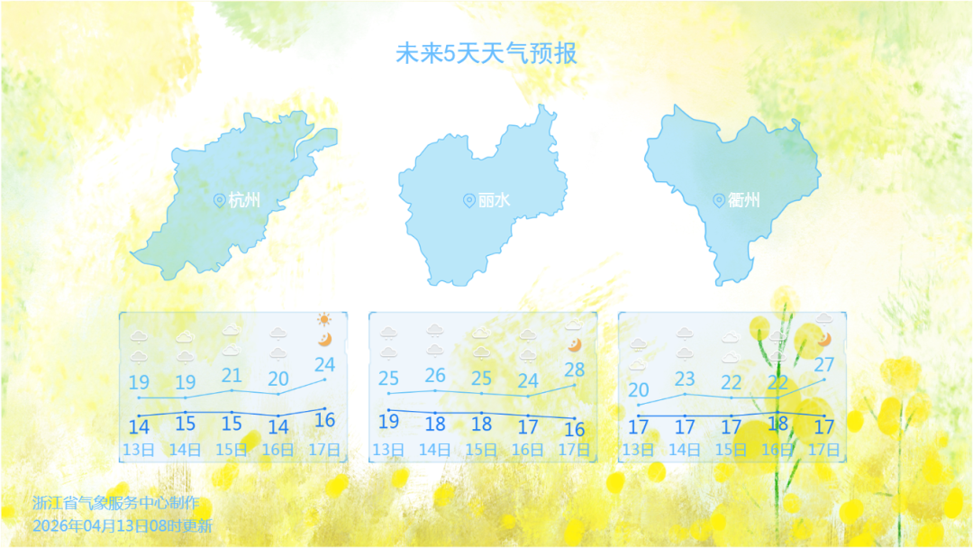 阴雨牵制下,我省大部气温被锁定在“舒适区”内,最高气温在17-24℃之间。但浙南有4个“显眼包”,还是跨过了25℃线,分别是:松阳和缙云25.8℃、丽水和庆元25.6℃。