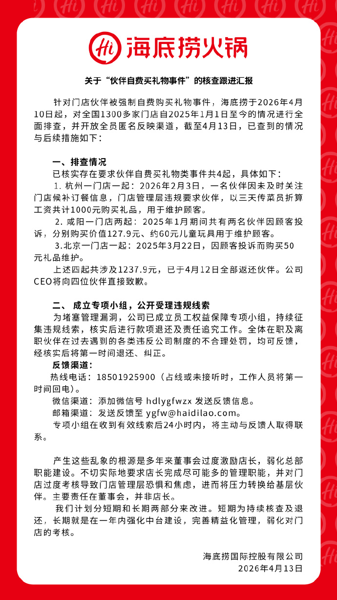 针对门店员工被强制自费购买礼物事件,海底捞于2026年4月10日起对全国1300多家门店自2025年1月1日至今的情况进行全面排查,并开放全员匿名反映渠道,截至4月13日,已核实存在要求员工自费买礼物类事件共4起,共涉及人民币1237.9元,已于4月12日全部返还员工。海底捞CEO将向四位员工直接致歉。